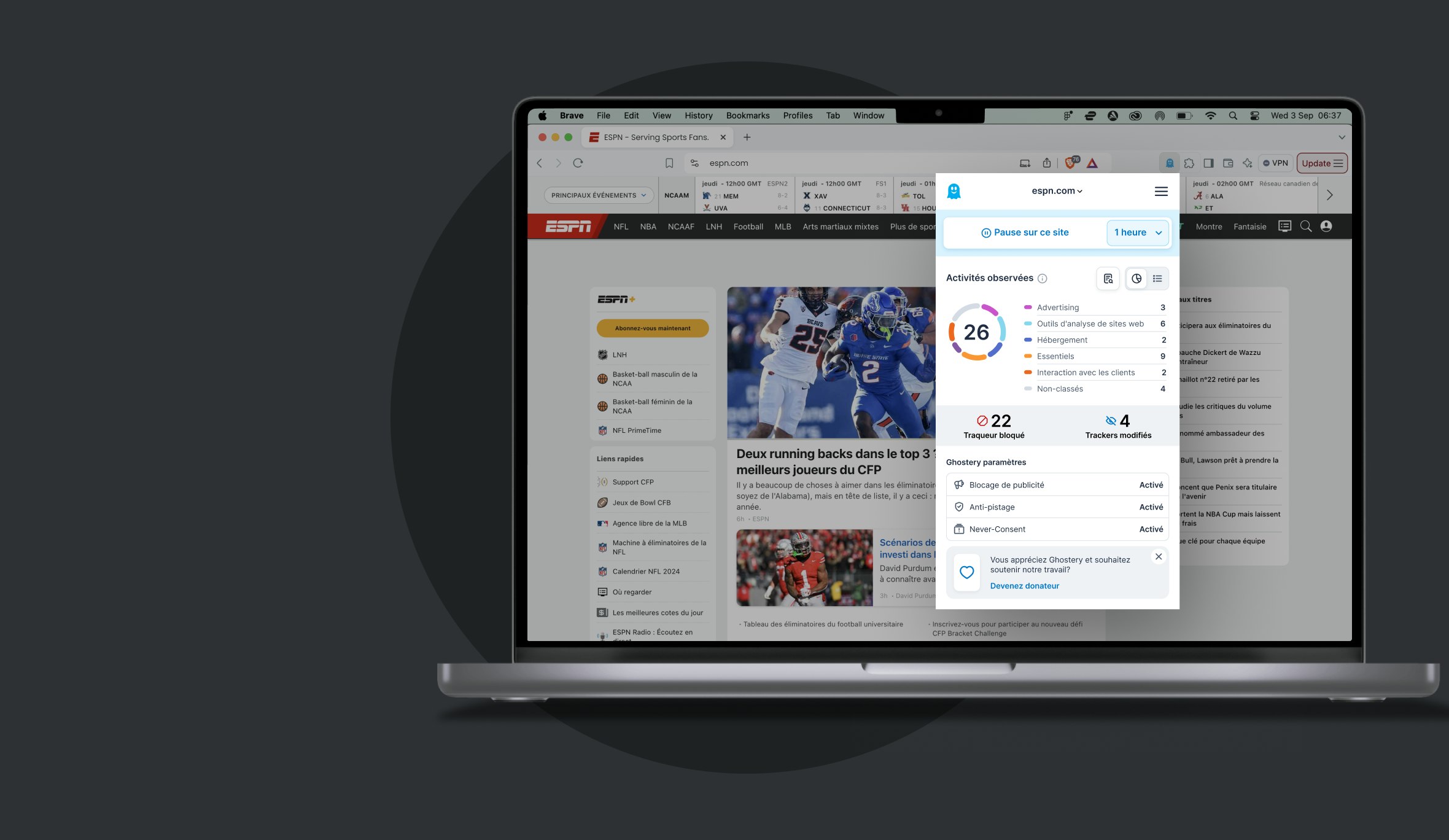 L’extension gratuite de Ghostery pour Brave, bloqueur de traqueurs et de publicités, optimise le web, accélère le chargement des pages, tout en économisant la bande passante et en prolongeant l’autonomie de votre appareil.